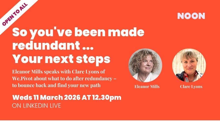 If you’d like a bit of help with your redundancy or any other transition, why don’t you join me and Clare Lyons Collins, CEO of We.Pivot (and an Occupational Therapist who was also the head of transformation in the NHS). We’re running a free webinar on Wednesday March 11th at 12.30pm online. Send your questions beforehand to Eleanor@noon.org.uk, marked TRANSITION.