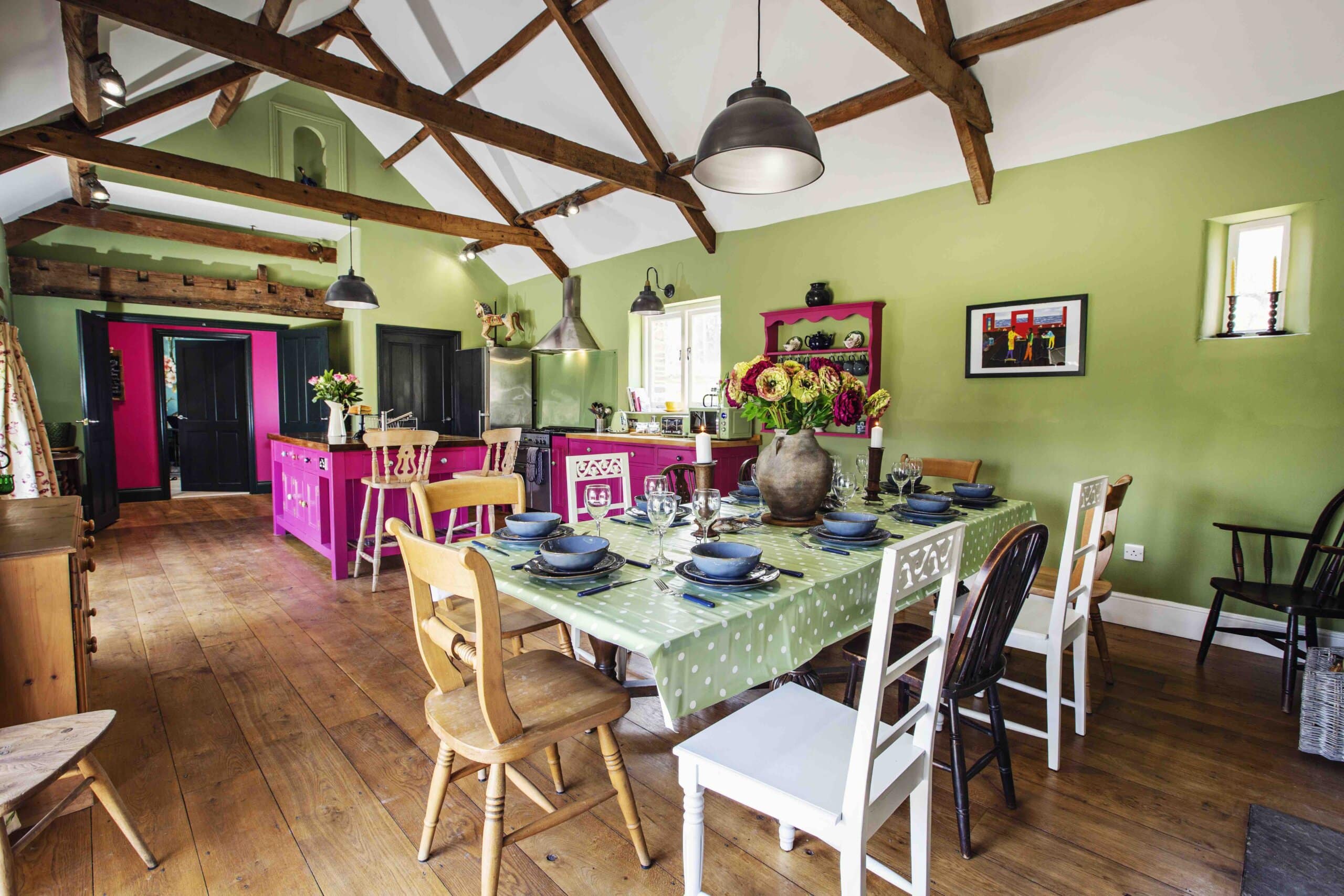 The owner is a world-renowned designer and it shows wherever you look. She is passionate about recycling, upcycling and bringing things of beauty back to life. We are taking over the whole farm and all its buildings and cottages including the stunning restored barn with its huge fire, beams and stone floor which will be the centre-piece of our retreat. The farmhouse and surrounding buildings have been renovated to an impeccably high standard and beautifully combine all the conveniences of modern life with the roots and history of the land on which it is situated.